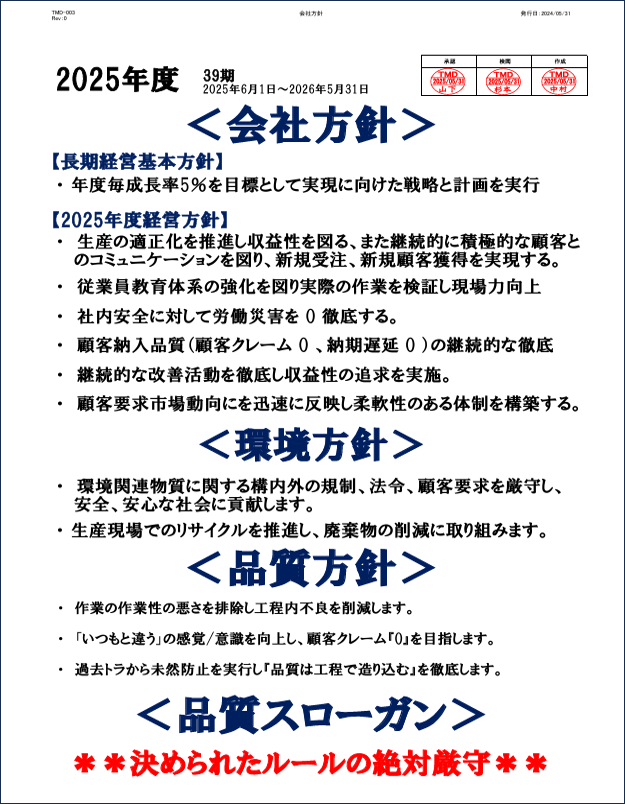『Zero Defect(ゼロディフェクト』を目標に生産活動実施